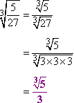 This is similar to the previous exercise, but here the cube (that is, the 27) is in the numerator. I can't simplify this expression properly, because I can't simplify the radical in the denominator down to whole numbers: