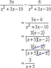 By the way, since I was able to cancel off the x − 2 factor, this eliminated a zero from the denominator. Depending on your book and on your instructor, you may (or may not) need to account for this change in the domain of the fraction.