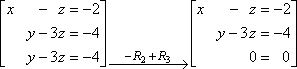 To find the solution, I have to solve the two remaining equations for x and y in terms of z. From the first row, I get: